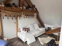 - aux combles : un dégagement/rangement, un séjour ouvert avec un poêle à bois et vue sur les montagnes, deux chambres, une salle d'eau équipée/un WC suspendu, un grenier.